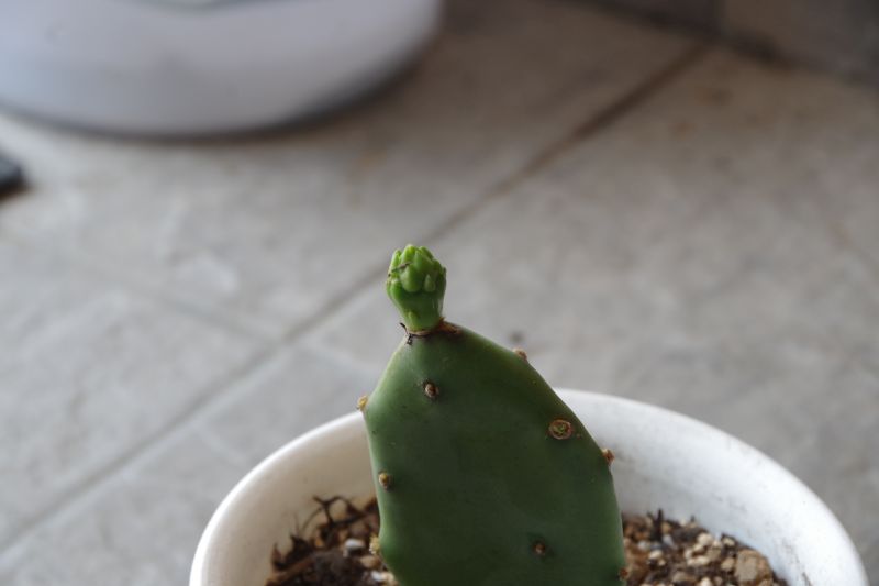なにか出てきています。サボテンの各部位をなんと呼んでいいのか分からないのですが、このサボテンは「挿しサボテン」が葉っぱみないな形状になっていて、この形状の物が増殖して大きくなっていく訳ですが(うまく説明が出来ず申し訳ない。)、たぶんこの生えてきた部分は、どんどん大きくなっていくんだろうなと想像できます。ただ、まだ土の下では根がそこまで大きくなっていないので、ただでさえグラグラとよれているのに上に伸びていって大丈夫なのだろうかと心配ではあります。もう少し締まる土に変えようかなあ。