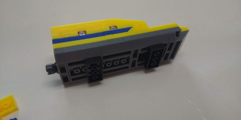 色々四苦八苦しながらなんとか前輪を運転席の窓の下あたりにずらしてみました。うん、この造形のが新幹線っぽくなったと自画自賛できます。ブロックをしっかり填めてから気付いたのですが、この造りだとタイヤと車体の黄色いブロックが微妙に擦ってしまうんです。